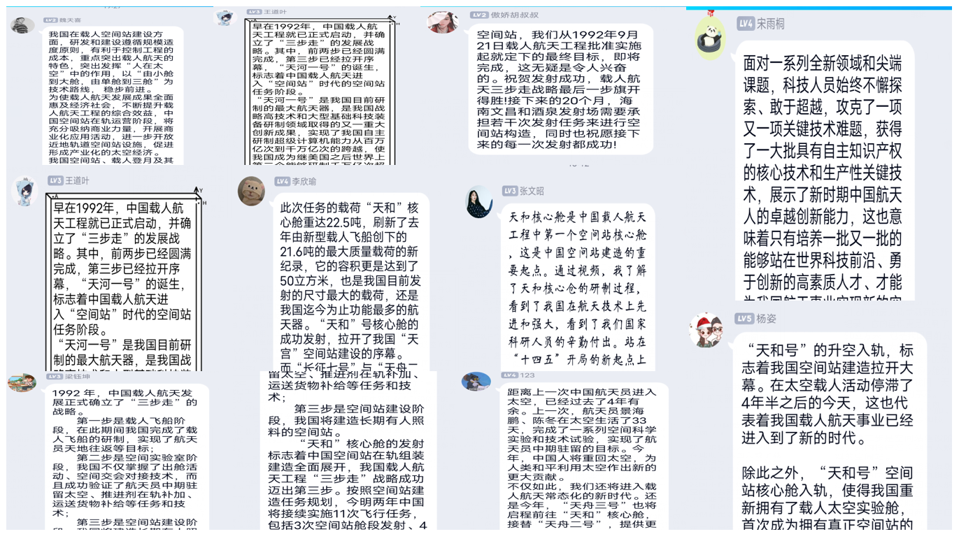 首先景建伟同学介绍了空间站的相关知识,空间站是一种在近地轨道长时间运行、可满足航天员长期在轨生活、工作以及地面航天员寻访的载人航天器,代表了当今航天领域最全面、最复杂、最先进和最综合的科学技术成果。中国从1992年启动载人航天工程以来,经历了从神舟一号飞船的试验,到神舟五号一人一天飞行,从神舟七号的太空漫步到神舟八号的空间对接。这些成就,在短短的三十年来,中国载人航天事业跨越了一次次的重大关口,实现了一次次的突破。如今“天和核心舱”的发射,将为我们国家未来建立的国家太空实验室奠定了重大基础,不仅彰显了我国在载人航天事业中的又一次伟大成就,还体现了中国人民的决心和才智,具有鲜明的中国特色和时代特征。
