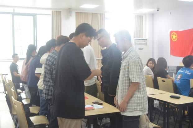 会议开始,全体人员齐唱国歌,伴随《义勇军进行曲》的旋律响起,大家庄严肃穆,注视着国旗,齐声唱响国歌。紧接着主持人宣布新团员名单,戢耀平、徐奥林、潘柞舟、魏晓敏、孙瑶、安成昊六位同学正式加入共青团。同时大会上强调了入团的意义:中国共产主义青年团是中国共产党领导的先进青年的群众组织,是广大青年在实践中学习中国特色社会主义和共产主义的学校,是中国共产党的助手和后备军。随后老团代表向新团员颁发团章、团徽后,新团员开始入团宣誓。每位宣誓人的语气中透露着坚定。宣誓完毕后,入团介绍人代表宣读《团章》中有关团员义务和权利的条款。