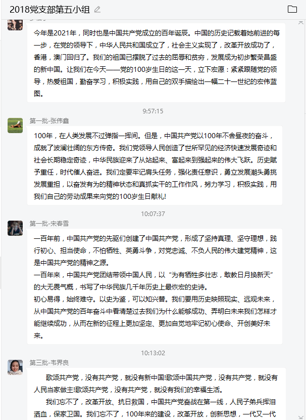 2021年7月1日上午8时,在北京天安门广场隆重举行中国共产党成立100周年庆祝大会。中共四川大学yl23411永利(集团)有限公司官网2018级本科第一支部委员会全体党员均于网络上认真观看大会直播,并积极发言讨论观看的感想。