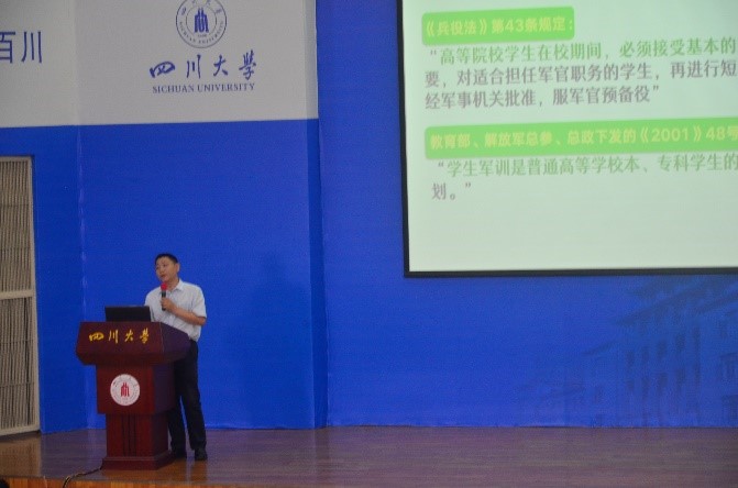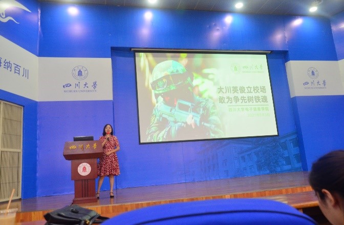 大会开始,为端正同学们参加军训的态度,激发同学们积极投身军事训练的昂扬斗志,陈笃海书记发表讲话。陈笃海书记明确指出大学生参加军事训练既是强健体魄的需要更是每位大学生需要承担的保家卫国的责任和法定义务。陈笃海书记详细地向同学们介绍了大学生参加军训的背景和现实意义。最后,陈笃海书记结合自己曾经参加军训的经历和往年学生参加军训所取得优秀成绩的事例,鼓励同学们敢于争先,在接下来的军训中竭尽全力树立电子人的铁血军魂,展现电子人的青春风采。最后,陈晓娟老师进行讲话,强调了军训期间的注意事项,并要求同学们在军训期间严格遵守纪律。