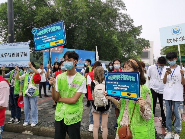 志愿者举牌迎接新生
