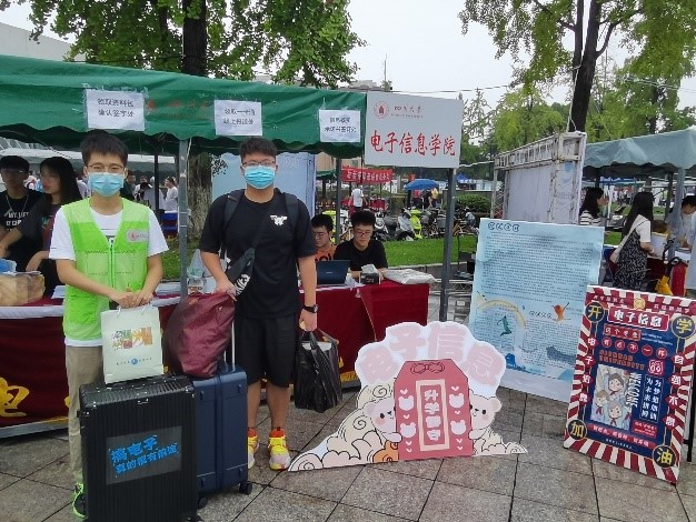 四川大学学生手册、大川小事知多少宣传手册、yl23411永利(集团)有限公司官网迎新手册,yl23411永利(集团)有限公司官网活动安全告知书、yl23411永利(集团)有限公司官网各学生组织介绍及报名表等资料以及防疫包等物品。早上八点,新生开始陆续到来。本次迎新,新生由摆渡车抵达青春广场后,便有举牌的志愿者协助其搬运行李到达学院摊位处。摊位处的同学则各司其职,井井有条地完成核对录取通知书,新生领取校园卡,新生报到签字等事项,省外的同学有专人负责带领到指定地点做核酸。我们的志愿者一边帮助新生拉取行李到寝室,一边热情地与新生进行交流,向他们介绍校园的方方面面。