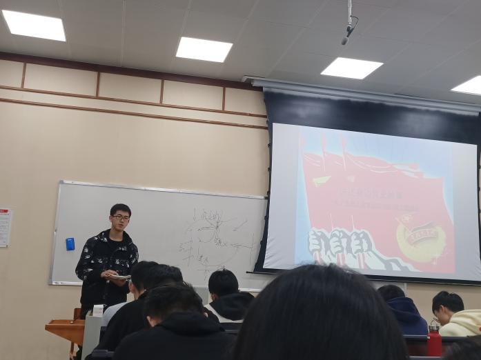 首先,赵国涛同学上台讲解了三万红军四渡赤水的故事,并结合本人手绘的行军路线图为同学们生动还原了四渡赤水的行动轨迹:红军一渡赤水进入云南扎西地区,二渡赤水夺取渡口,面对蒋介石的重兵进攻,毛泽东同志经慎重考虑决定三渡赤水,而后突然调转方向四渡赤水,将敌人主力甩到了后面。最终红军主力大步开进云南,并从容渡过金沙江,开始了新的伟大征程。