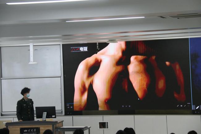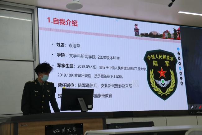 会议中,2020级文学与新闻传播专业学生袁浩翔和2019级材料科学与工程 专业学生刘恭增身着军装,进行了征兵工作的宣讲。在完成自我介绍后,两位同学首先谈及其参军经历和自我感受,向同学们讲述了他们在军队中的日常训练以及执行的任务。随后,他们以参与四川大学军训任务及2021年四川大学国庆升旗任务为主线,介绍了自己的退伍生活。最后,他们就参军的报名流程以及入伍的优惠政策及待遇进行了介绍,圆满完成了本次的宣讲。yl23411永利(集团)有限公司官网的同学们深受宣讲的鼓舞,以极其热烈的掌声回应了此次的宣讲。