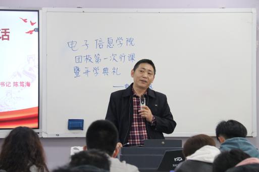 在主持人简短的开场后,同学们激昂澎湃地奏唱团歌,嘹亮的歌声彰显出共青团员的精神面貌。紧接着,同学们重温了入团誓词。宣誓完毕后,学生代表邢闯进行发言,他呼吁青年团员要积极学习新思想武装自己,坚定自身理想信念。接下来,在李云天同学宣布完考核规则后,主讲人陈书记正式开始授课。