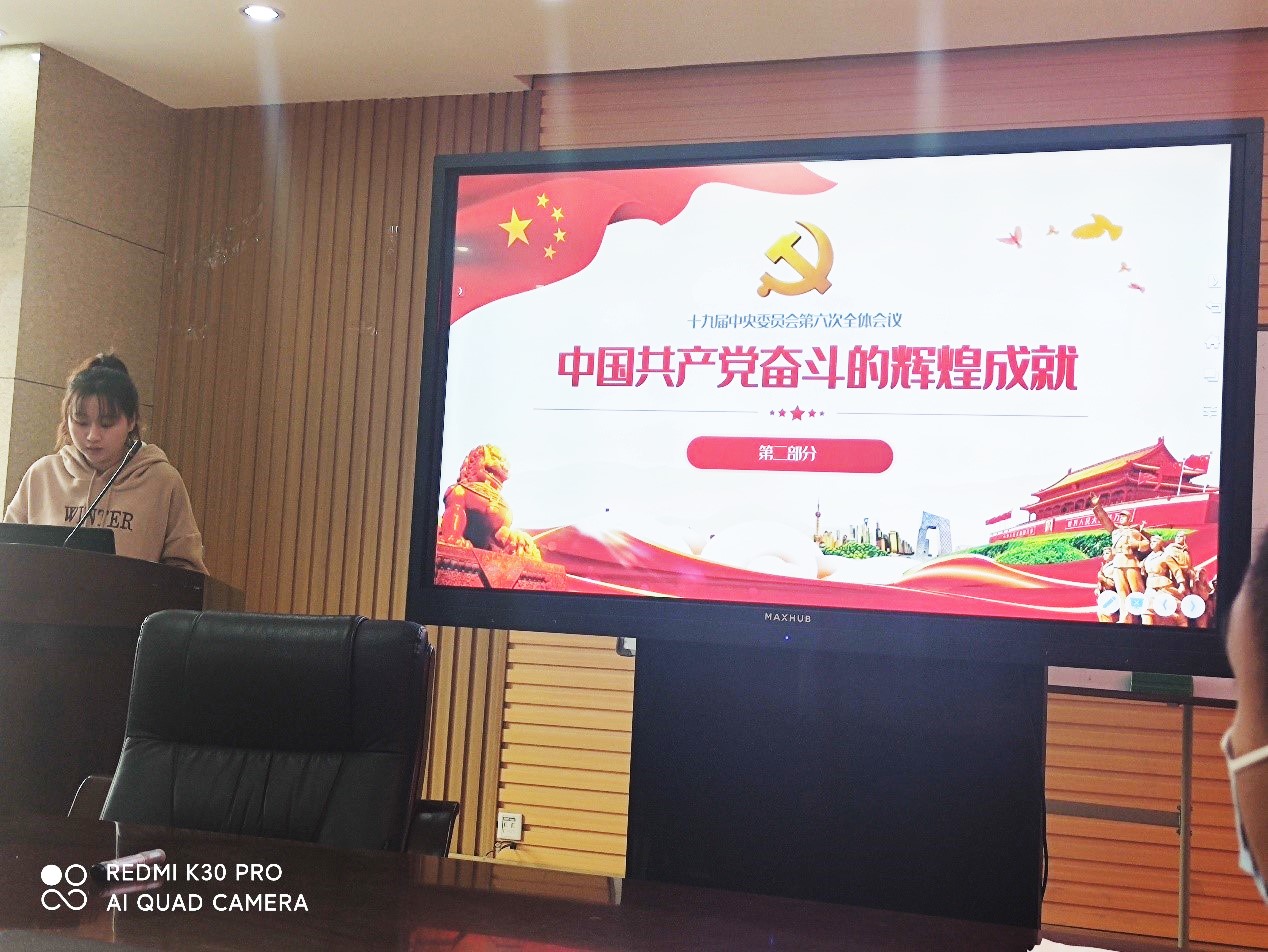 组织生活会首先由朱晓庆同志组织大家学习党的十九届六中全会,她从全会概况、中国共产党百年奋斗的辉煌成就和学习贯彻六中全会精神三个部分进行讲解。指出总结党的百年奋斗的重大成就和历史经验,出于“三个需要”的考虑,一是在建党百年历史条件下开启全面建设社会主义现代化国家新征程、在新时代坚持和发展中国特色社会主义的需要;二是增强“四个意识”、坚定“四个自信”、做到“两个维护”,确保全党步调一致向前进的需要;三是推进党的自我革命、提高全党斗争本领和应对风险挑战能力、永葆党的生机活力、团结带领全国各族人民为实现中华民族伟大复兴的中国梦而继续奋斗的需要。进而让大家从党的百年奋斗中看清楚过去我们为什么能够成功、弄明白未来我们怎样才能继续成功。