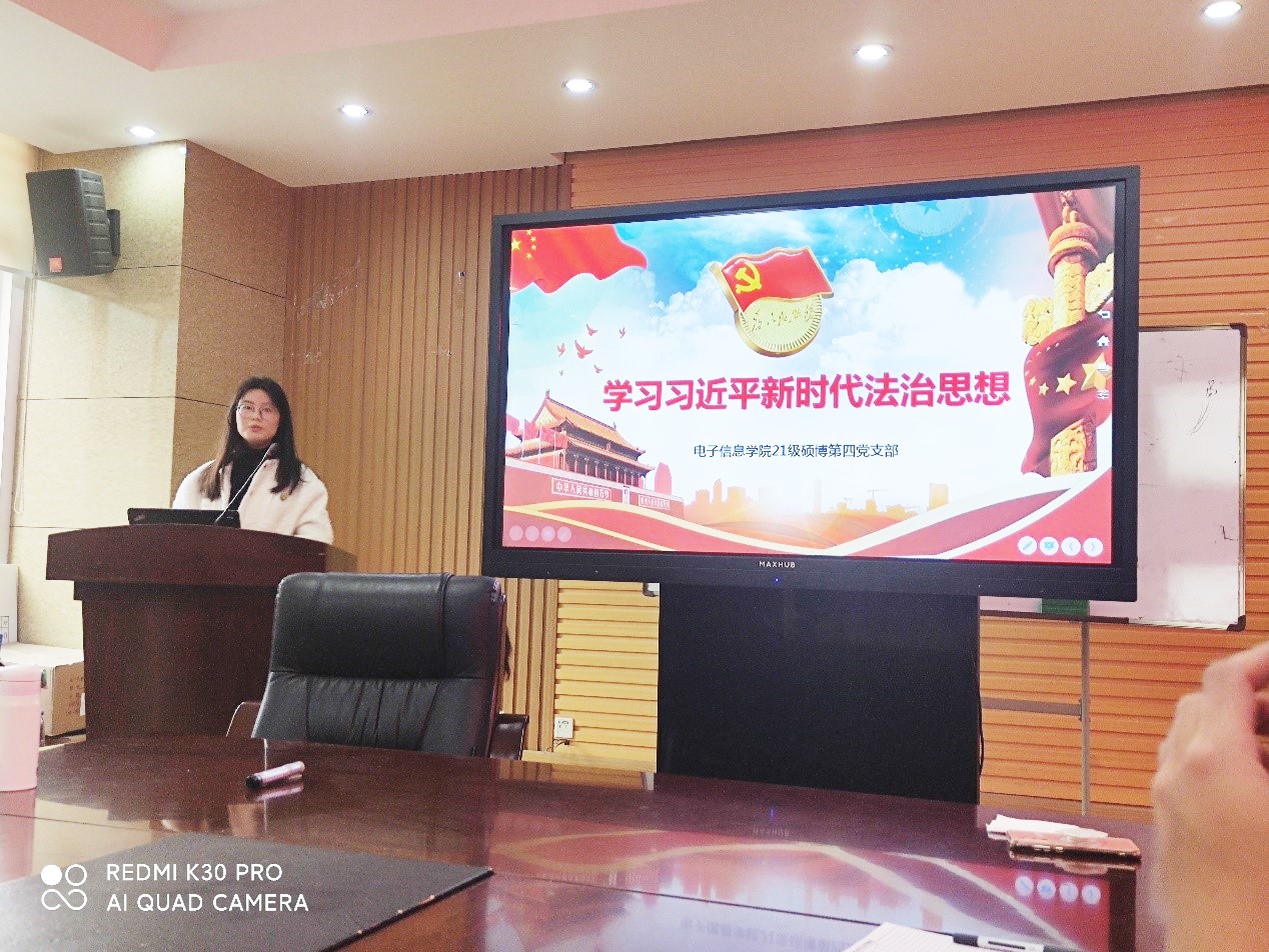 随后,王雪娇同志组织大家学习习近平法治思想。她从提出背景、核心要义、深刻意义3个方面进行了讲解。习近平法治思想是马克思主义法治理论中国化的最新成果,是习近平新时代中国特色社会主义思想的重要组成部分,是全面依法治国的根本遵循和行动指南,作为青年学生,我们应该学习法律知识,掌握法律方法,参与法律实践,深刻认识习近平法治思想的重大意义,深刻把握其政治意义、理论意义、实践意义和世界意义,作为党员同志,更要带头尊法守法守法用法,自觉将习近平法治思想的精神融入到日常的学习生活中。