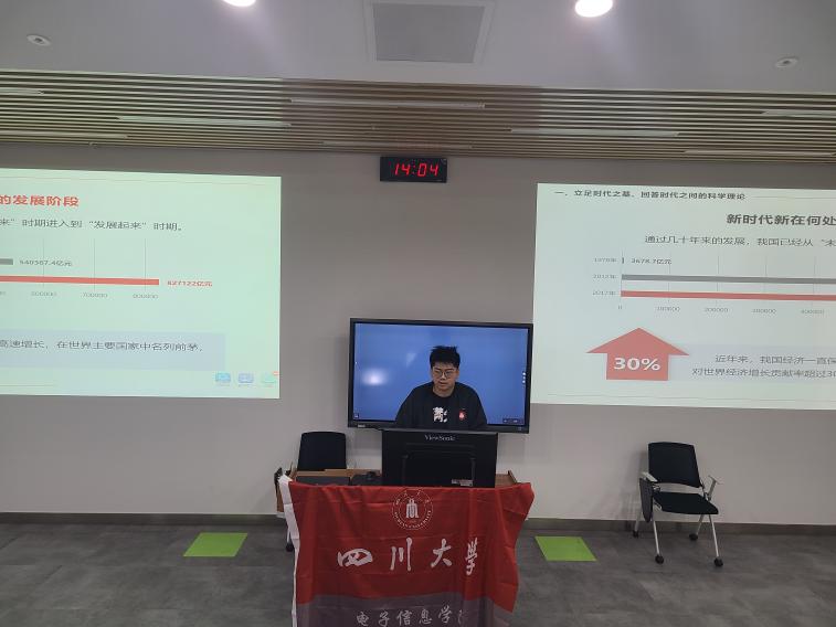 四川大学百川学生宣讲团yl23411永利(集团)有限公司官网分团第四次宣讲于2021年12月10日在四川大学望江校区基础教学楼C座104教室面向本科2019级同学开展。本次宣讲由2019级本科党支部宣讲员邹浩宇带来题为“习近平新时代中国特色社会主义思想是党和国家必须长期坚持的指导思想”的分享。学院李运国老师、吴秀玲老师以及2019级本科光信息科学与技术专业、通信工程专业同学参加本次宣讲会。