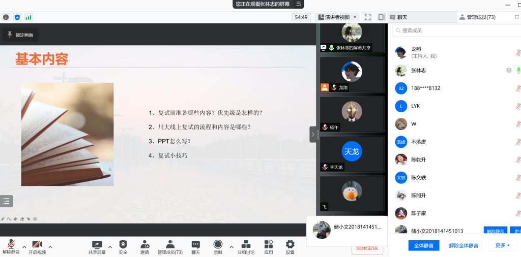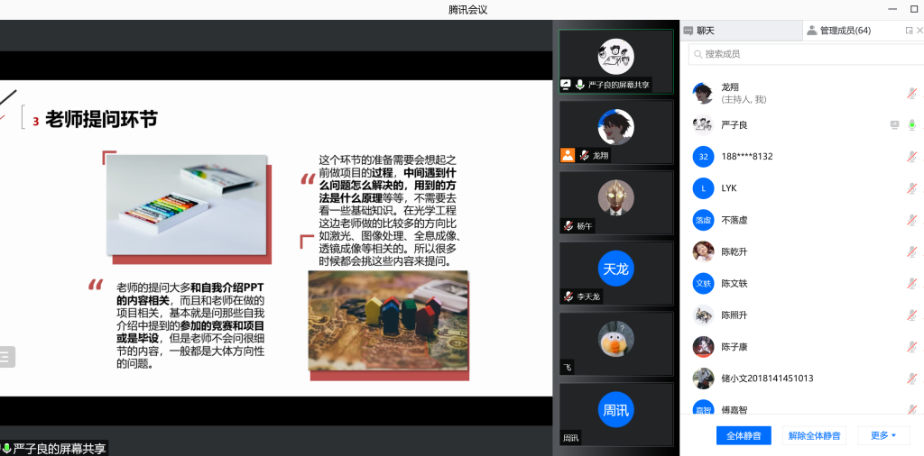 考研初试成绩出来后,不同情况的考生需要根据自己的分数情况尽快安排相关的事宜,为了让同学们能够有更多充足、有效的准备,yl23411永利(集团)有限公司官网本科2018级于3月3日14:30举办了线上“考研复试经验交流会”。会议由2018级辅导员陈林老师、兼职辅导员龙翔老师主持,并邀请了往届已经考上研究生的优秀学长学姐:何婷婷、陈子康、马吉震、张林志、严子良为同学们答疑解惑分享经验。