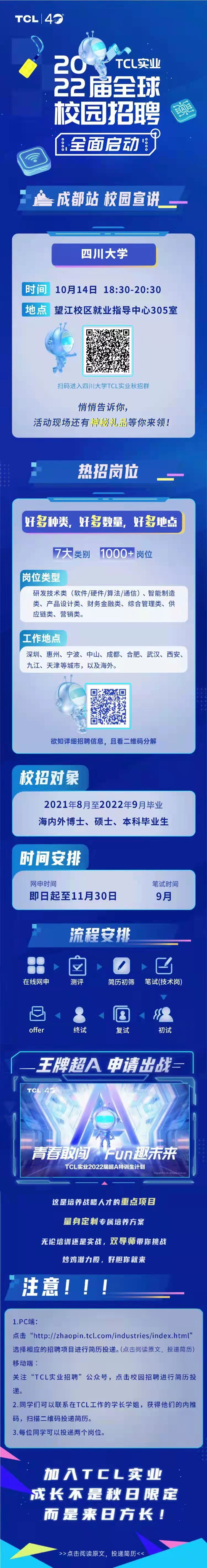TCL实业 x 四川大学 线下宣讲来啦!现场礼品丰厚等你来拿❗TCL智能手机钻石工艺美妆镜极简美学运动耳机 更有TCL实业 + 岗位需求等你 在这里,你想要的都有💯 『160+国家/地区』的国际化发展平台 『全业务链路』的轮岗机制 『一线城市 』福利机制 『超年轻』的工作氛围 『高管导师』手把手培养时间:10月14日18:30 - 20:30地点:望江校区就业指导中心305室