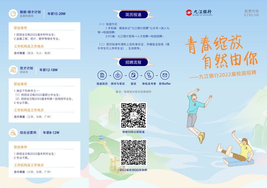 🚩投递方式:微信关注公众号“九江银行招聘”在线注册-加入九银-校园招聘