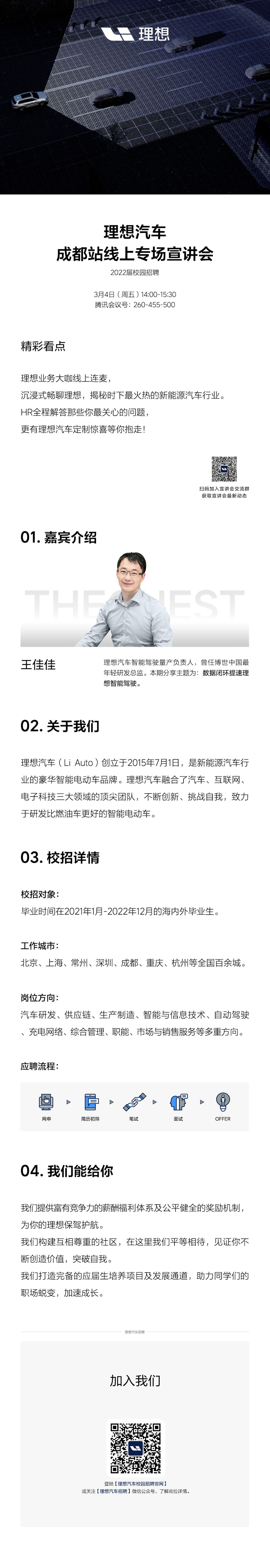 理想汽车2022春季校园招聘 —【城市专场宣讲会—成都站】火热来袭!本场宣讲会涵盖研发制造、自动驾驶、销售与服务和职能岗位等九大类岗位信息;更有理想大咖,带你揭秘时下最火热的新能源汽车行业;还有理想汽车HR为你在线答疑,传授面试锦囊。我们诚挚以待,期待在理想的地方遇见更好的你。